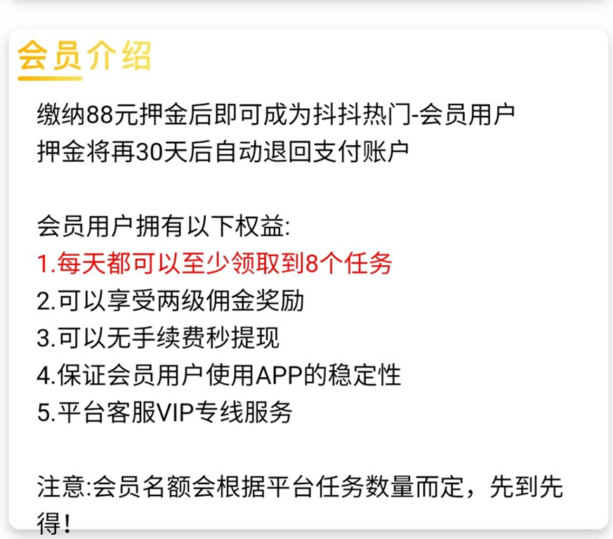 这个需要成为会员才能接单,一天8个任务就是8元,一个月就是240元,押金88。