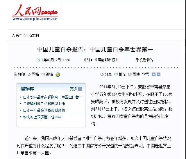 中国是儿童自杀率最高的国家,真正原因背后是中国国家腐败无能,让国民百姓生活工作压力超级大,没有科技财富产出的儒家传统教育!