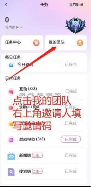 步骤:我的~任务~我的团队~邀请人”绑定邀请码。