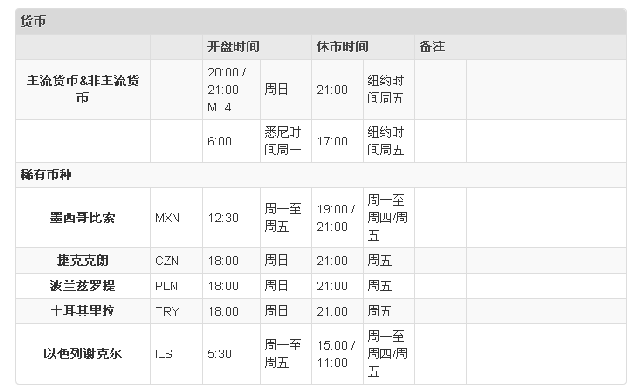 *捷克克朗(CZK),波兰兹罗提(PLN)和土耳其里拉(TRY) 的正常交易时间是每日的7:00到15:00格林威治时间(周一至周五),以上时段是货币流动性最好的交易时段。相当于北京时间14:00(夏至)/15:00(冬至)到22:00(夏至)/23:00(冬至)周一至周五。在正常交易时段以外时间,正常交易点差会被扩大。
