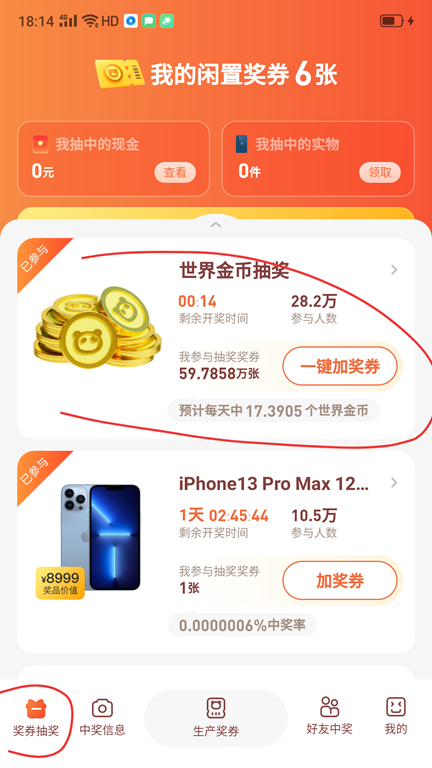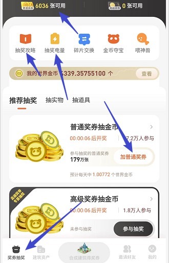 1、有时间记得检查闲置的奖券,一键投入到世界金币抽奖里面去挖币,不要浪费–分一秒,有闲置奖券就投进去。