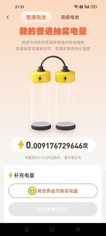 所有参与抽奖的奖券会消耗抽奖电量,普通奖券消耗普通电量,每五万普通奖券一天消耗一度电,补充电量可以花费金币购买,也可以观看广告补充三度电,每天只能观看一次充电广告。普通奖券的电价采取阶梯制,根据本月耗电量决定电价,电价与奖券参与金币抽奖的产能挂钩,最低档电价相当于消耗奖券抽奖所得金币的百分之二十,最高档电价相当于消耗奖券抽奖所得金币的百分之四十。