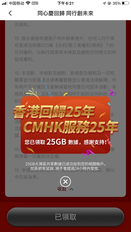 转载请注明文章来源:美奥黄金理财 - 美股 $ 黄金 » 庆香港回归25周年,CMHK香港中国移动送25G流量,有效期从领取当天算起60天,可以在中国内地,香港,澳门两岸三地使用。有效期从2021年7月1日到2021年7月31日截止,抓紧时机赶快去领取免费25G三地流量吧!