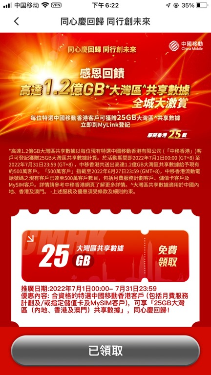 香港回归25周年,CMHK香港中国移动送25G流量,有效期从领取当天算起60天,可以在中国内地,香港,澳门两岸三地使用!