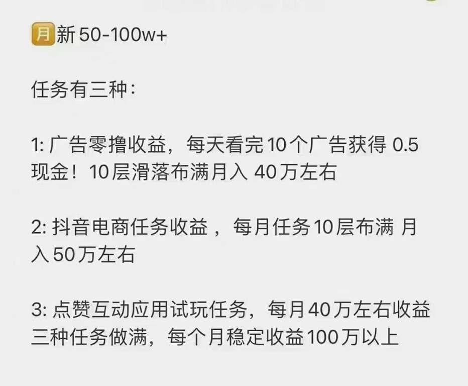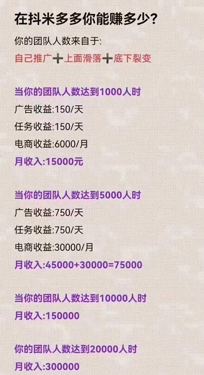 抖米多多,10代%30收益模式,每人每月收入50万元。一共9万人