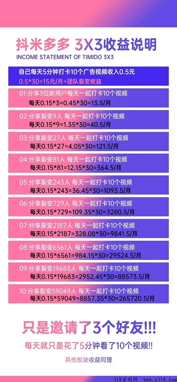 玩法:只要推广三人,就能三三自动滑落,10层团队奖