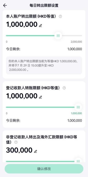 例如,客户将限额从低于100 万港元提升至超过100万港元,限额将立即提升至100万港元,而剩余部分将在1个工作日后生效。