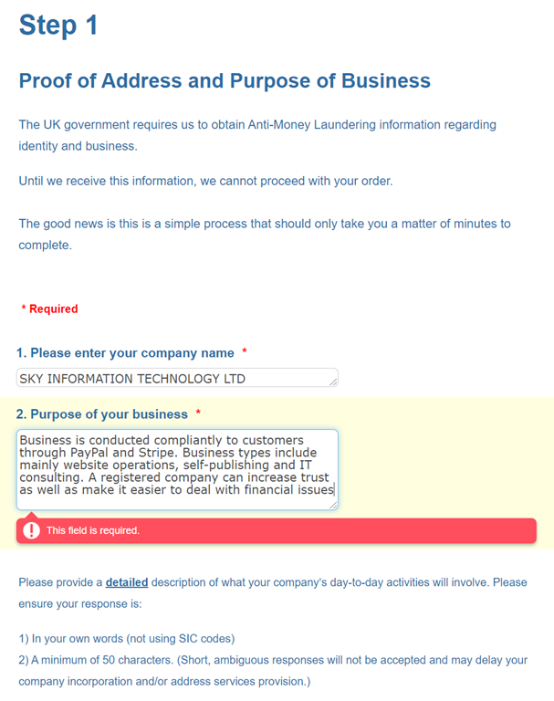 为降低出错风险,我们建议您购买提交前审核服务 – 在订购过程中需支付 4.99 英镑。这将确保我们的一位专家在提交给 Companies House 之前审查您的公司申请并纠正任何错误。