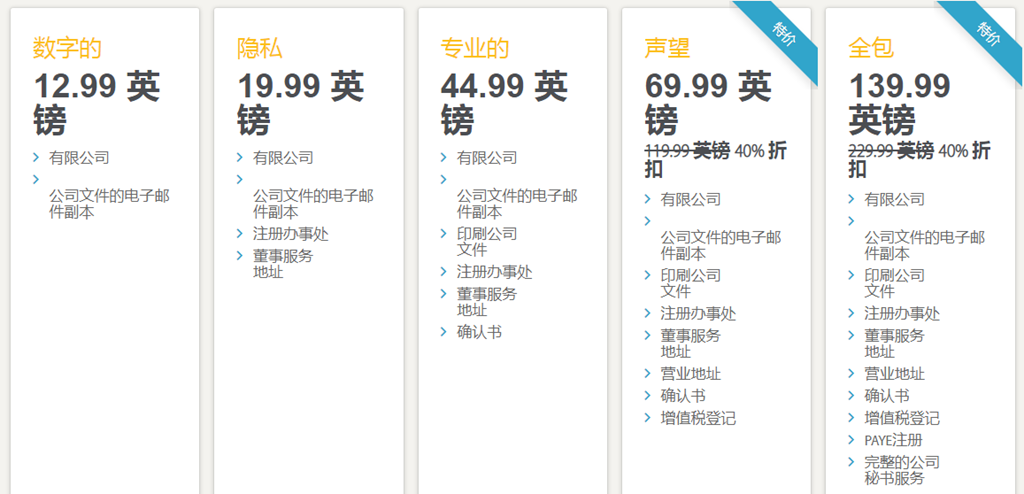 注册英国公司以19.99 英镑为例,主要考虑有隐私服务,和注册英国公司提供办公室地址,而最便宜的12.99 英镑套餐没有