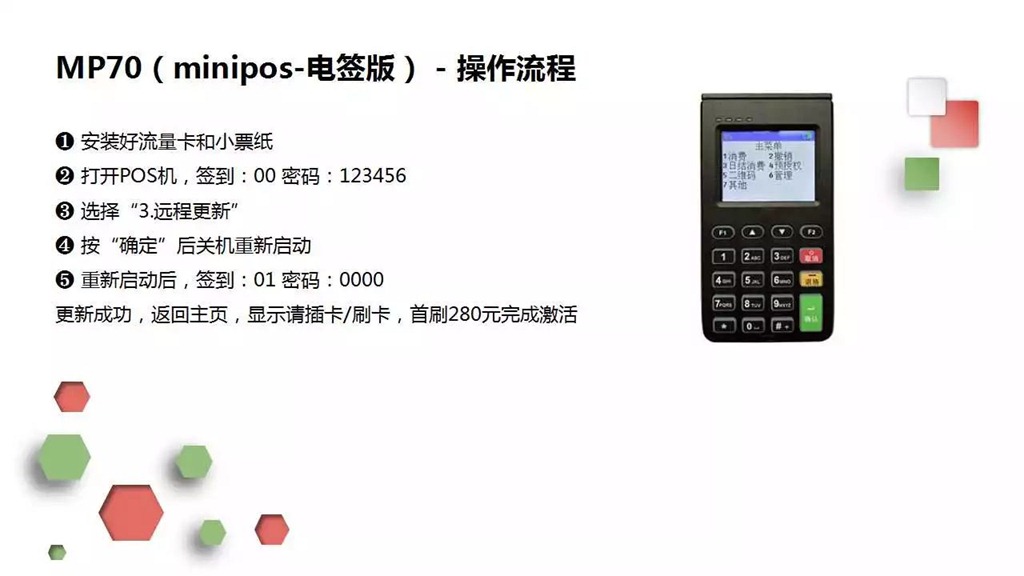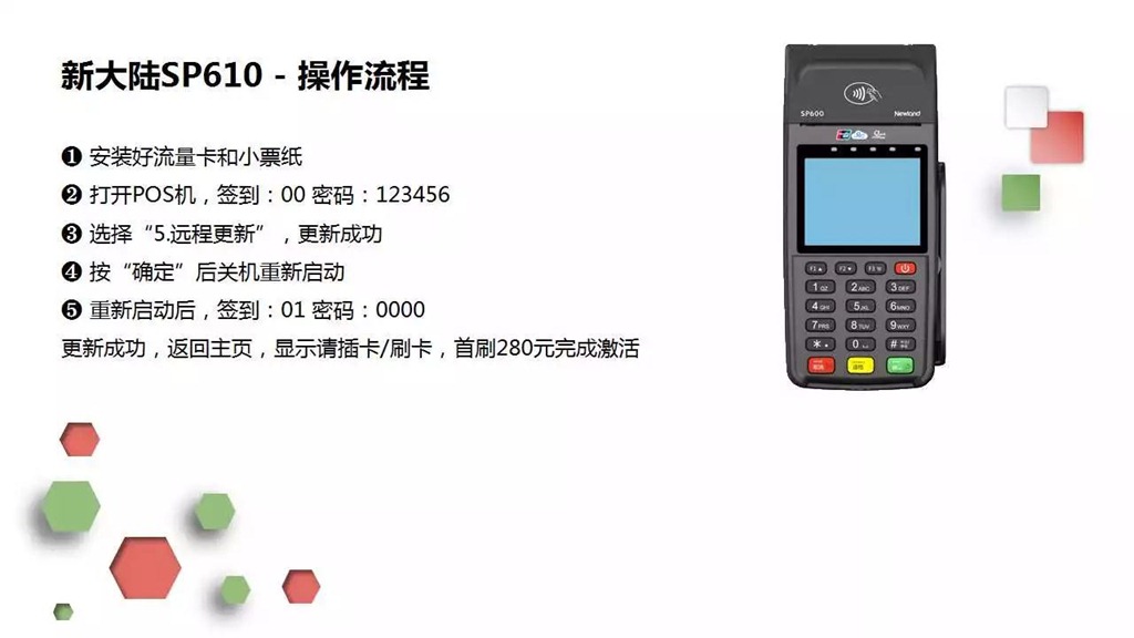 1、长按电源键开机,签到操作员:01,密码:0000 之后按确认键,选择1消费,按提示操作即可;如果交易卡没有闪付功能,可按8其他,然后选择2插卡消费,第一笔输入280,支付机器押金,这280是不到帐的;按机器提示输入密码,签字即可(电子签名,机器下面有一个签名笔,直接在机器屏幕签名即可),手机号可以不需输入,交易完毕,会出小票。
