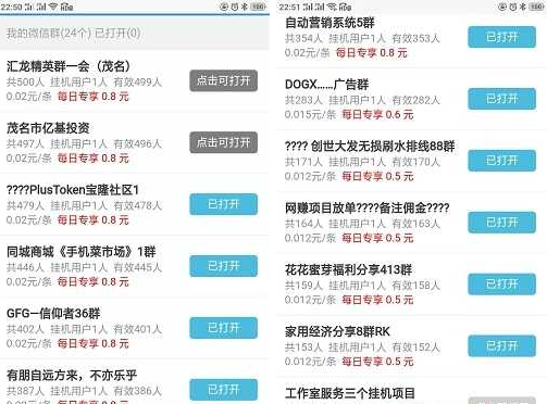 设置群发管理。默认是所有群都不会发消息的,这样你即使挂机了也没有收益。所以要管理一下群。点击首页的“微信群管理”,第一次多点进去刷新一下,你微信上的群都会显示出来。然后可以群发消息的群点击旁边的“点击可打开”,这样就开启了群发设置。像你的家人群、朋友群、工作群、同学群等不用打开,也不会打扰他们,不会影响你正常使用微信。