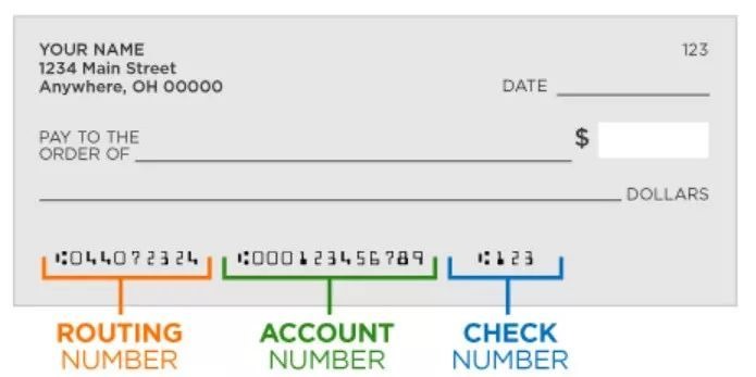 关于你的 Checking Account,有三个重要的号码——即 Routing Number,Account Number,以及 Debit Card Number。其中前两个号码会显示在你的个人支票上,如下图: