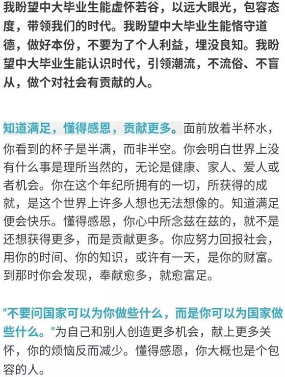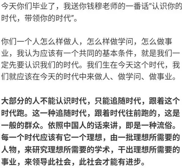 这是一个利益在前,道德在后的时代:金钱、地位、权力,已经成为世人追逐的唯一之物,道德和价值观的培育,却渐渐被人遗忘。壁立千仞,无欲则刚。但愿你们不要让利益掩盖良心,以厚德载物自许。我们所追求的,理应是较名与利更能持久的东西。