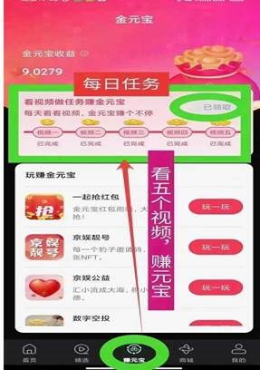 认证完成后自动送15积分任务包,每天点下面的“赚元宝”花3分钟看5个小视频,然后领取收益。