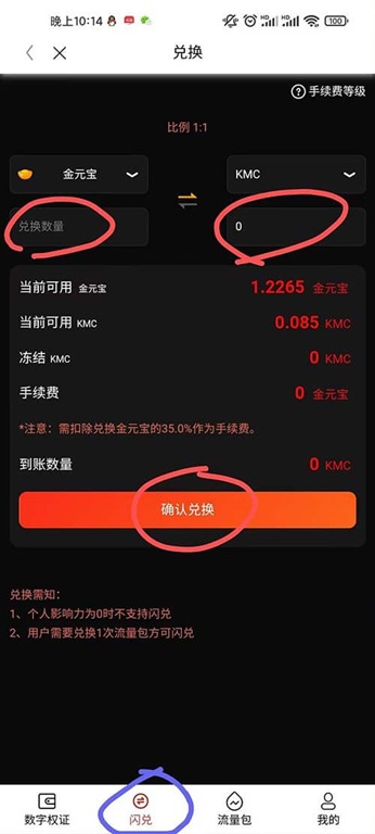 进入到【数字权证】页面后,点击底部导航上的【闪兑】,将我们的元宝兑换成“KMC”。“KMC”是啥?我也不知道,就是用“KMC”来卖钱的!
