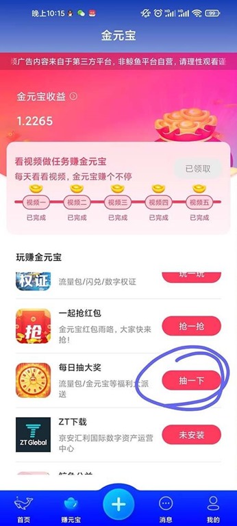 鲸鱼短视频是中国京安平台推出的一款短视频平台,注册认证好之后每天看完五个视频就可以领取0.5个金元宝,金元宝够10个之后可以点击数字权证然后兑换更多的流量包,这样每天的产出的就会越来越多,使用这个方法复投就可以快速发展起来。