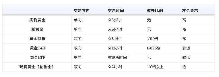 以下将简要的介绍各种主要黄金投资产品,以及归纳它们在交易时间、槓杆比例、本金要求等各方面的资料以供参考。