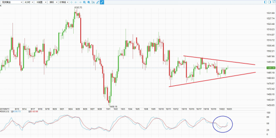 4小时线图分析,KD金叉,上方有1497.41及1495.29的压力线,下方有1474.10及1477.20的支撑线,形成收敛三角形的整理格局。