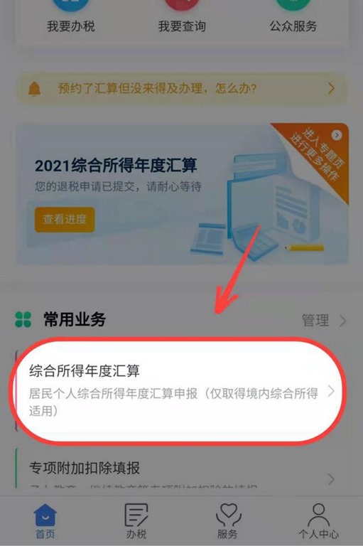 第四步:(重点❗❗❗申请退税的这一步终于到了)回到首页,点击综合所得年度汇算