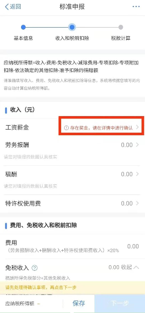 其中在工资薪金一栏中,如果右侧有“存在奖金,请在详情中进行确认”的红色字样时,我们需要点击进去。