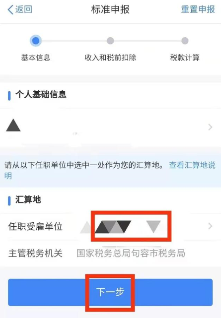 接下来会来到个人信息以及汇算地的这个页面,在这里面,我们可以清晰看到自己受雇单位以及主管税务机关等选项。这些都准确无误后,直接点击下一步。