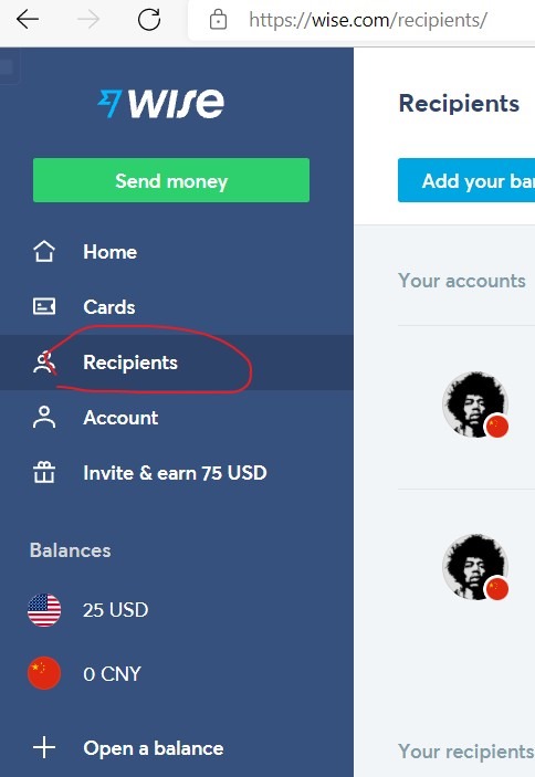 在wise手机APP的下方有【Recipients】收款人选项,点进去添加收款人。