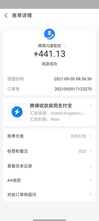 就在以上步骤完成的大概十几秒,就收到了银行的信息提醒,进账,接着支付宝也弹出信息,有海外汇款进账。