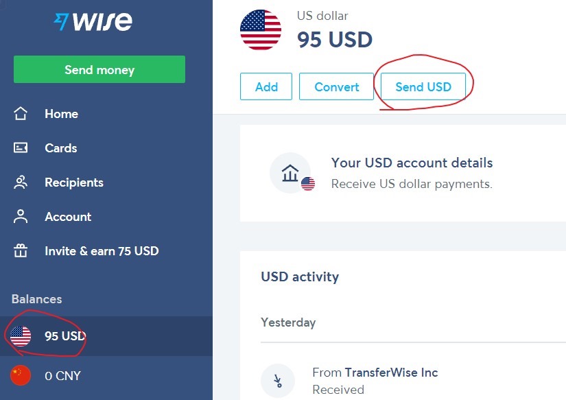 如果在wise里的资金是外币,需事先兑换成人民币。在该外币种选项卡里点击【Convert】按钮进行兑换,Transferwise会收取一点点的手续费,可以忽略不计。