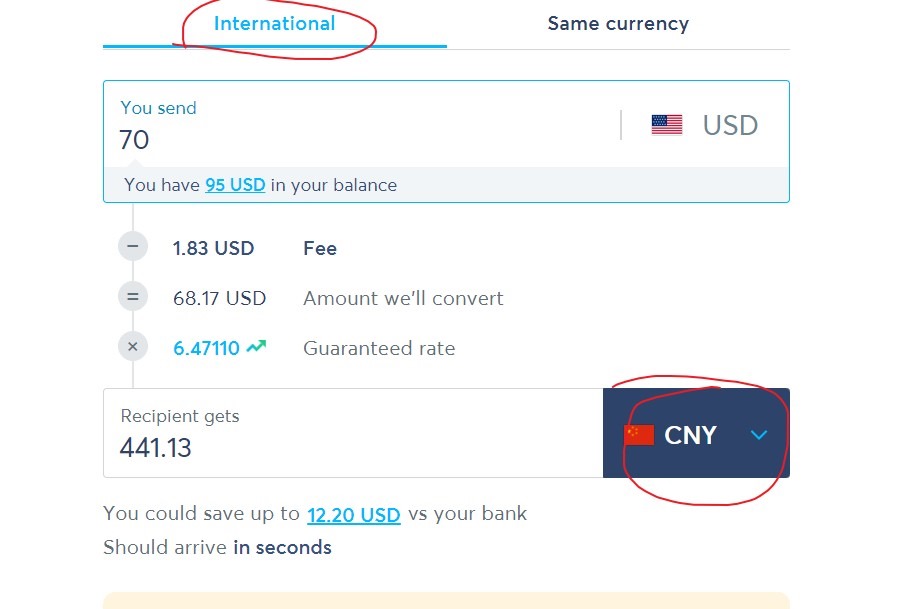 2. 电汇:使用你的银行手动将资金转移到Wise,然后再进行汇款,收款人预计在6小时手动汇款;