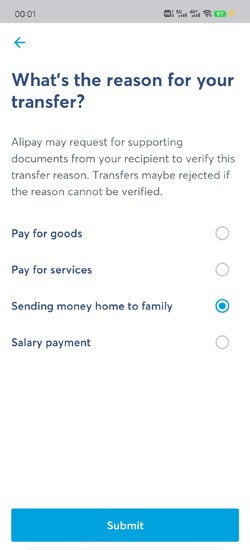 转账原因:汇款给「其他人」需说明原因,应该是法规要求;  可选「向家人汇款」或「工资转账」。 我这次选择的是向家人汇款 (Sending money home to family),直接就入账了。 之前有几次也忘记是选的哪个,被支付宝要求提供申报资金来源性质。  反正Wise提现还是有点玄学的。明明提现到支付宝每年50万的额度还没用完,有时就直接入账了,有时却要求你申报。