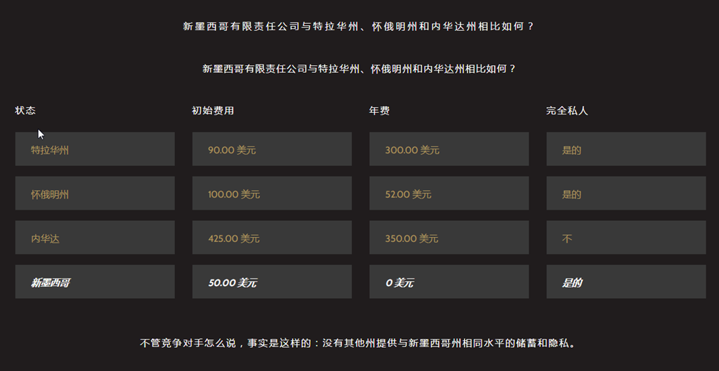 價格:新墨西哥有限責任公司是美國最便宜的匿名有限責任公司。沒有一份年度報告能在公司的一生中節省數百美元。您只需要維護一個新墨西哥州的註冊代理。注意,我們的代理服務包括免費郵件轉發可以選擇升級到虛擬辦公室。