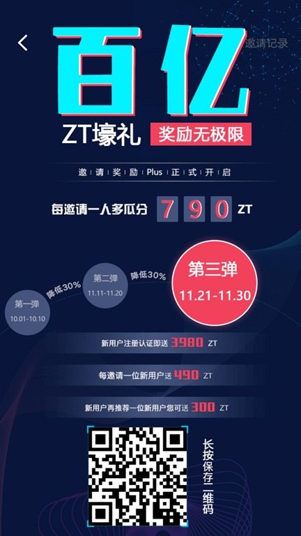活动期间,用户注册即可获得ZT币,完成实名认证享四倍ZT币,推荐好友加入ZT.COM,推荐人除常规积分奖励外,好友再推新人,